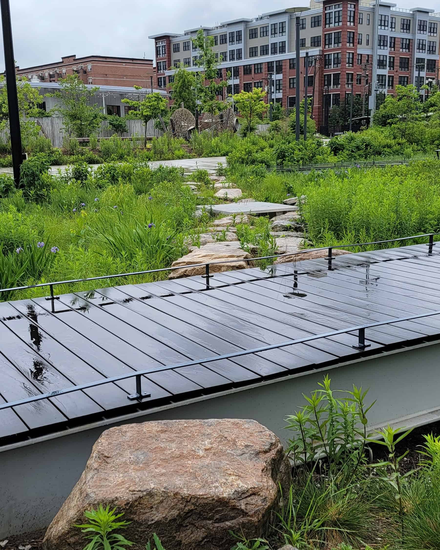 The 6-acre park captures and stores one million gallons of stormwater on site in a below-ground storage tank regulated by a wet weather pump station, while providing almost another million gallons of storage in surface green infrastructure elements integrated throughout the park’s programmatic spaces.