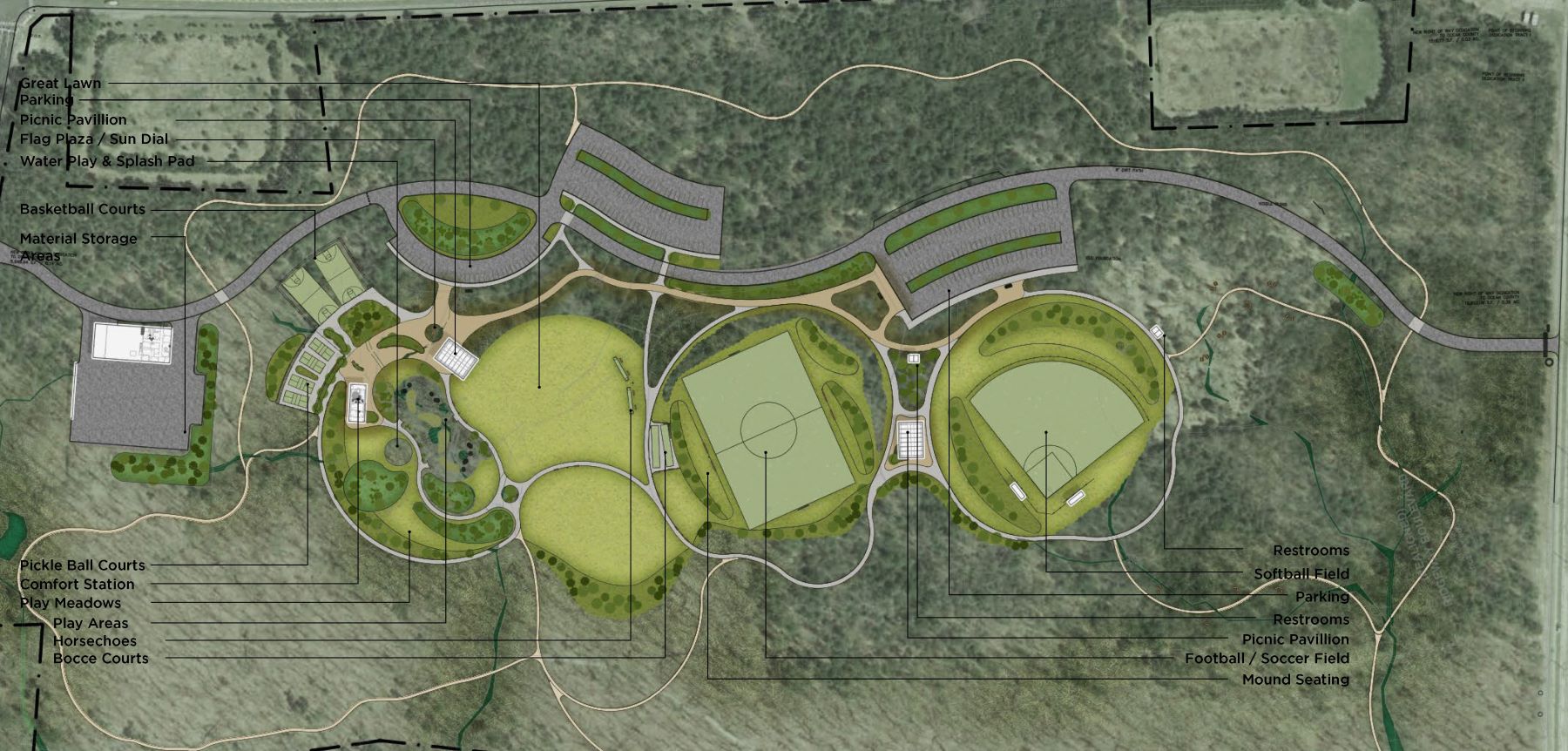 More specifically, our design team envisions athletic fields, pavilions, a water reuse system for a splash pad and irrigation, nature play, and miles of new trails and outdoor fitness equipment.