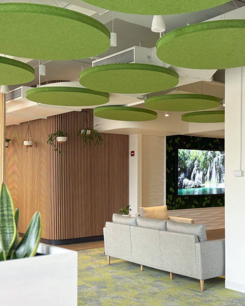 Each zone of the floorplan is mapped intentionally and equipped with a customized acoustical solution that blends seamlessly into the biophilic theme of the space. Hanging acoustical treatments are reminiscent of tree canopies and forests. Glass walls host multi-purpose transparent panels to reduce speech frequency acoustical reflections while allowing light to cascade through. Wall and ceiling solutions take on the look of wood, stone and moss.