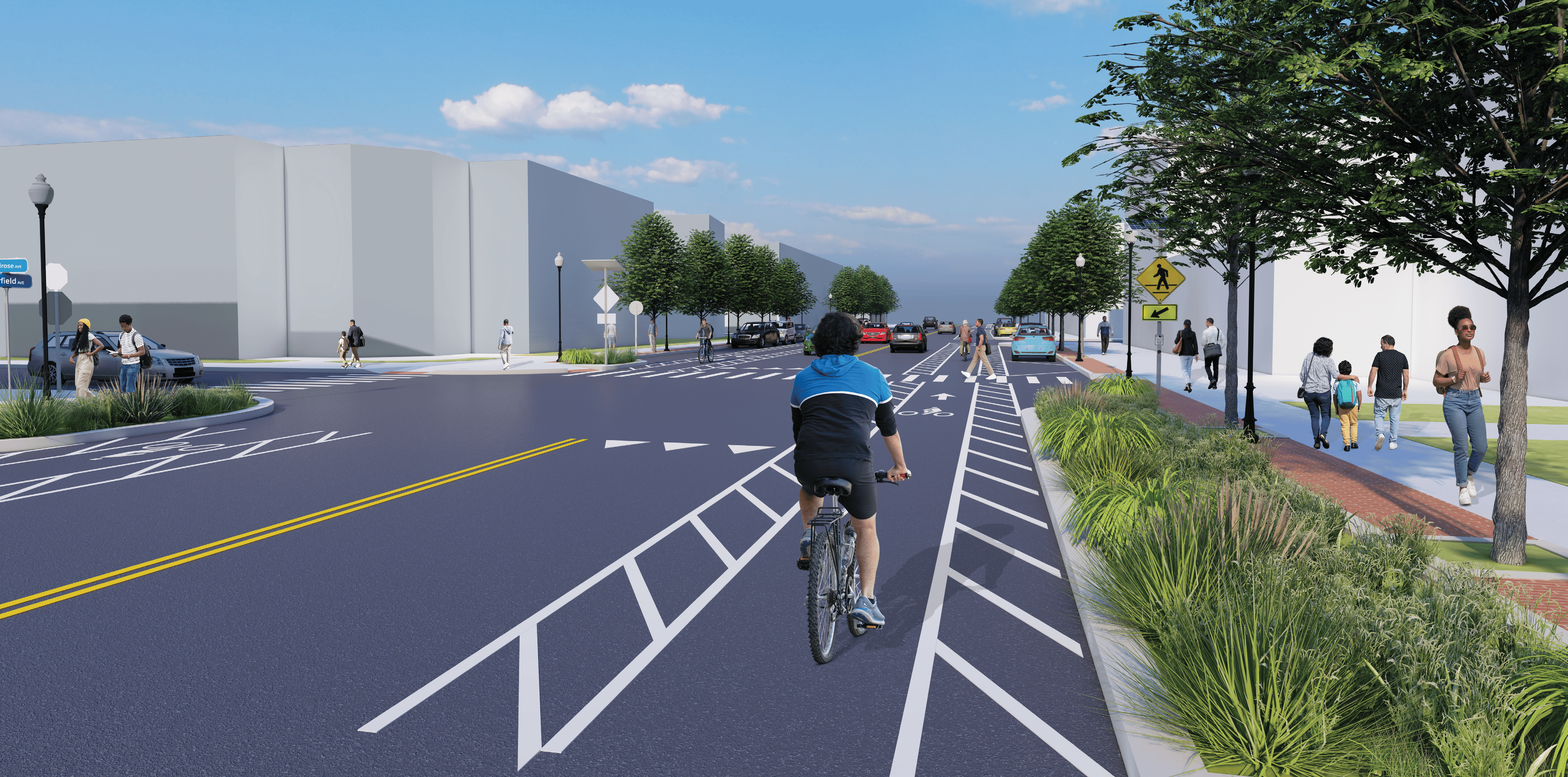 Our preliminary concepts for Fairfield Avenue addressed lane reductions, pedestrian and bicycle infrastructure, transit bus stop pullouts, on-street parking, green infrastructure, and traffic circulation. The focus for Brewster Street was to better define parking and travel lanes to improve safety and traffic flow.