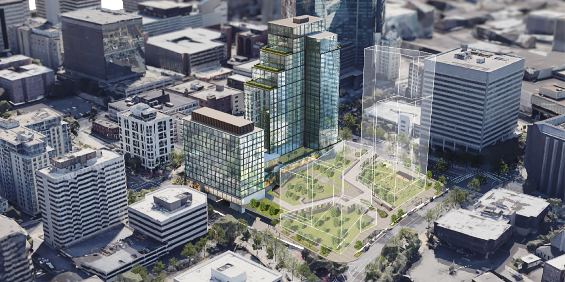 The development will consist of four residential and office buildings; co-working, retail, and dining space; a parking garage; and an elevated public park.
