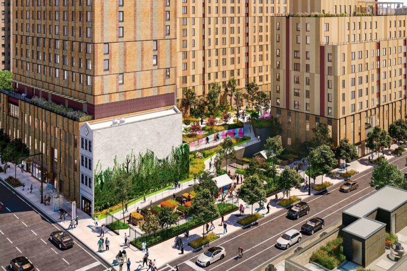 The project by Breaking Ground, BRP Companies, and The Hudson Companies includes five buildings totaling 1.1 million square feet of residential, retail, and community space and an open-air skate park. The development program includes 992 units of affordable, supportive, and mixed-income housing.