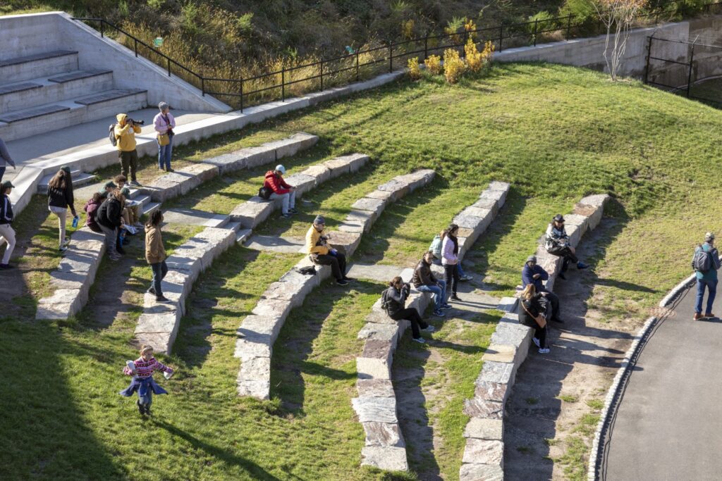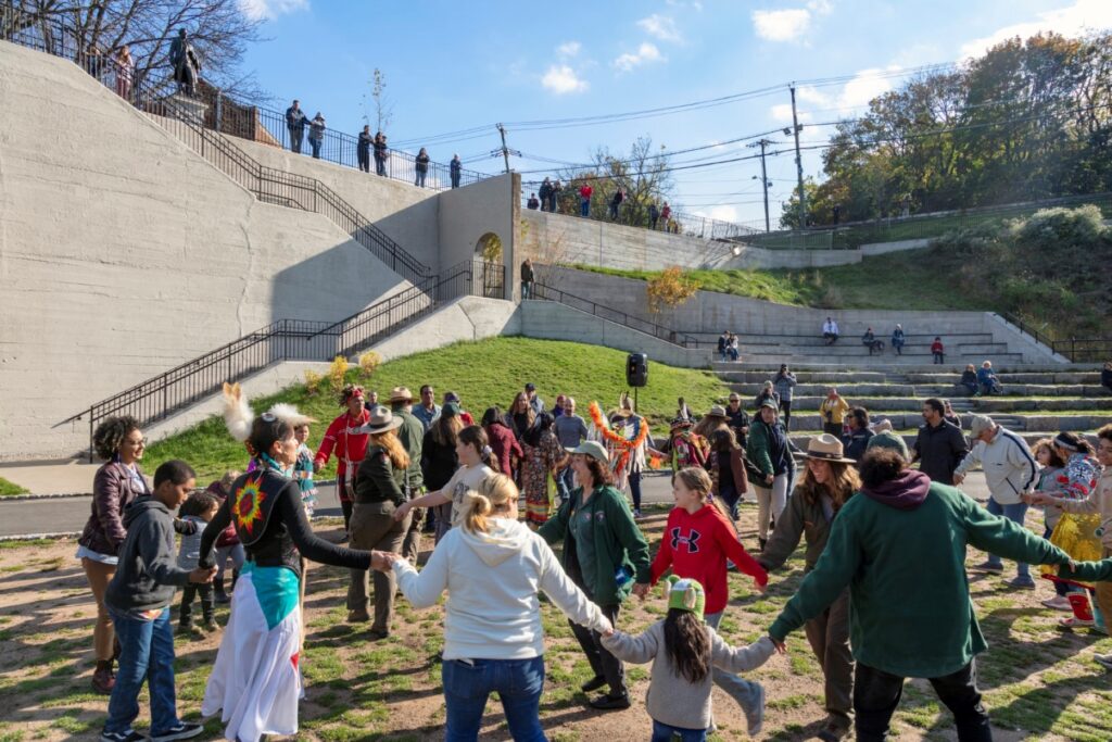 Our design team was charged with maximizing views, public accessibility to the park, pedestrian circulation, and stormwater management on a site that has steep slopes and extreme topographic changes of over 50 feet. Our solution involved the creation of terraced levels and catwalks throughout the park, as well as an amphitheater for viewing the falls.