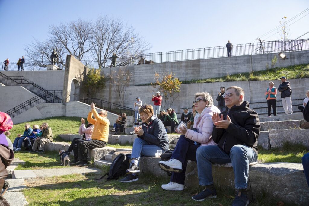 Stormwater from upper levels is captured in bioswales and conveyed to lower levels, where it is slowly released through two earthen berms that hold the amphitheater. All disturbed soil was relocated into landscaped berms where it could be capped and serve to accent and support other park features.